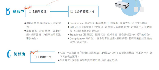 最後,大部分人在簡報前都會練習預講幾次,但事實上,簡報之後的「再練習」也很重要。多做這一步,才可以將「剛剛應該這樣說才會更精采」的懊悔與學習,轉化為新的簡報技巧。因此,下台後,讓自己再快速地短講一次,不但能訓練自己的口條,也可以為下次的簡報做好萬全準備。